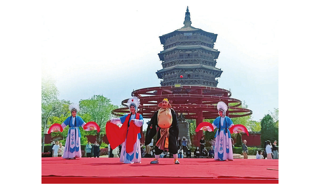 应县祈园广场搭起的耍孩儿剧公益演出舞台上,正在演出耍孩儿剧目《狮子洞》。 山西日报记者马占富摄 “五一”假期,在国家...