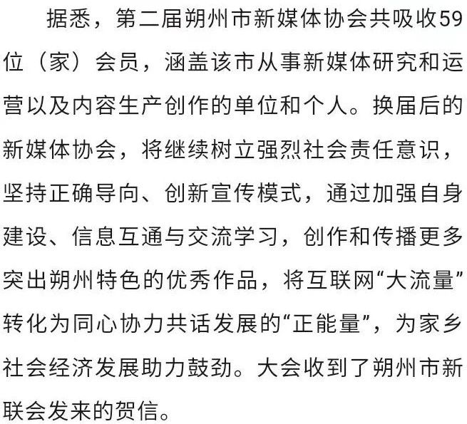大会经全体会员认真选举产生了第二届理事、秘书长、副理事长(副会长)、理事长(会长)、监事、监事长,标志着成立6年的朔州市新媒体协会圆满完成换届。